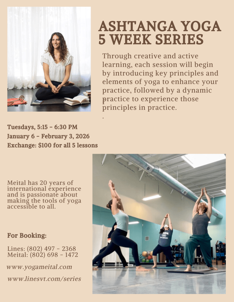 Ashtanga Yoga 5-Week Series – learn key principles to deepen your practice. Tuesdays, 5:15-6:30 PM, Jan 6 – Feb 3, 2026 at Lines Vermont